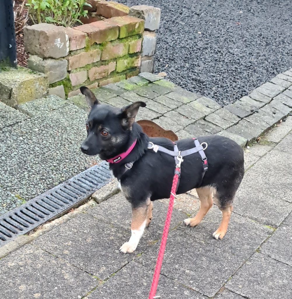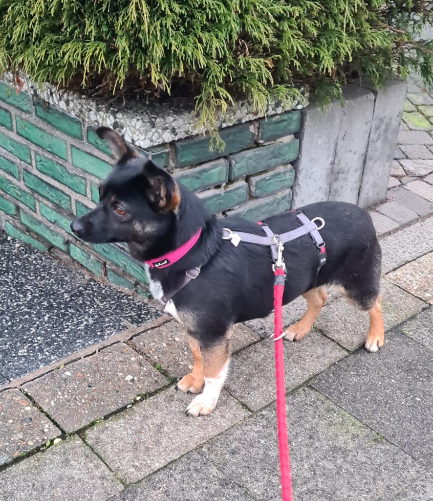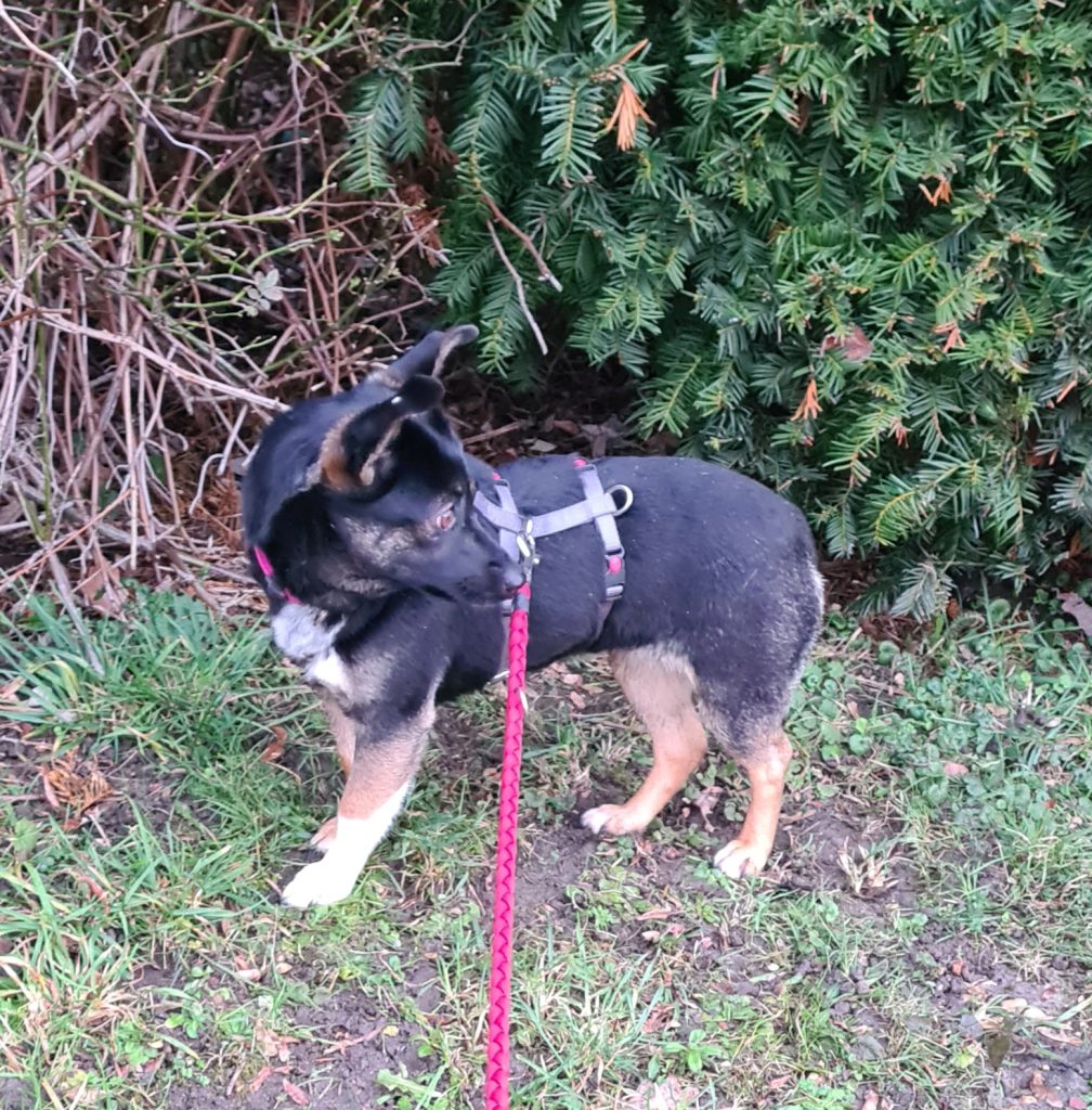 Marcy macht sich schon ganz gut an der Leine, manche Dinge, die ihr offenbar noch fremd sind, schaut sie sich staunend an und geht dann weiter mit.