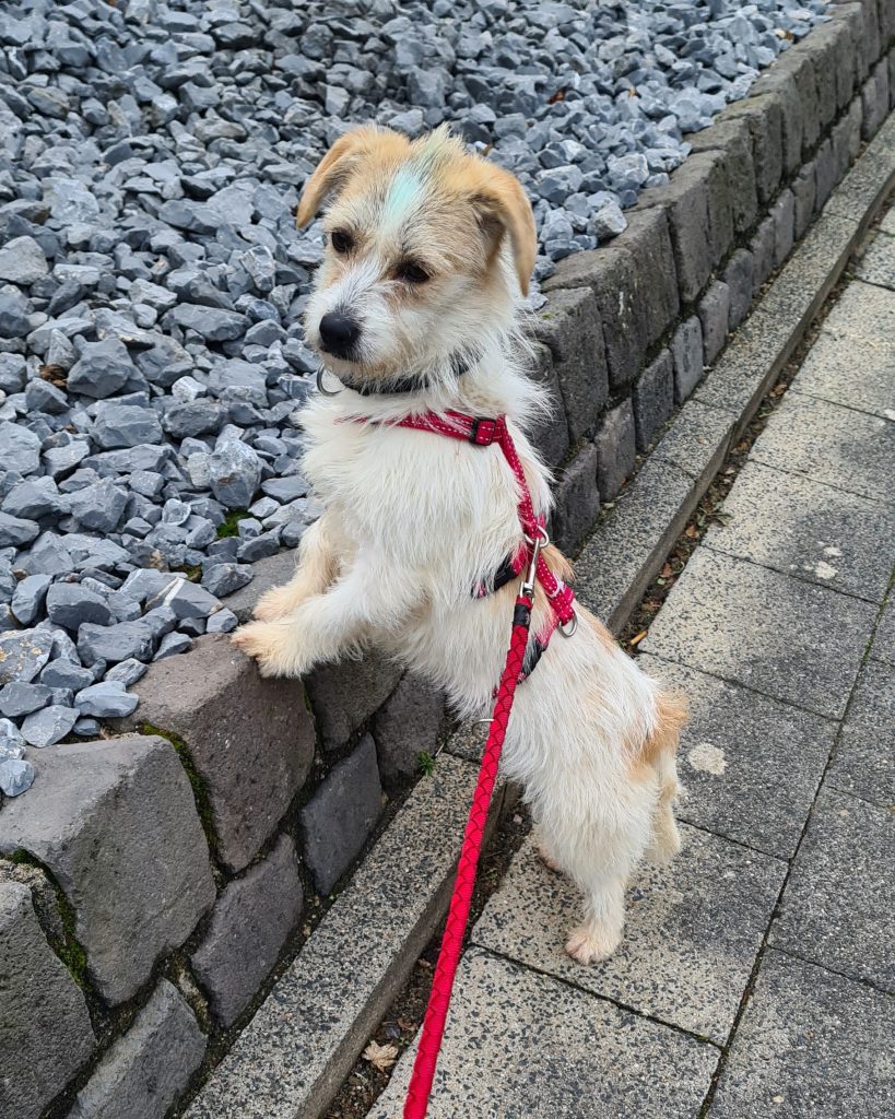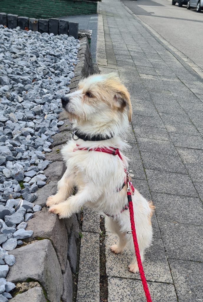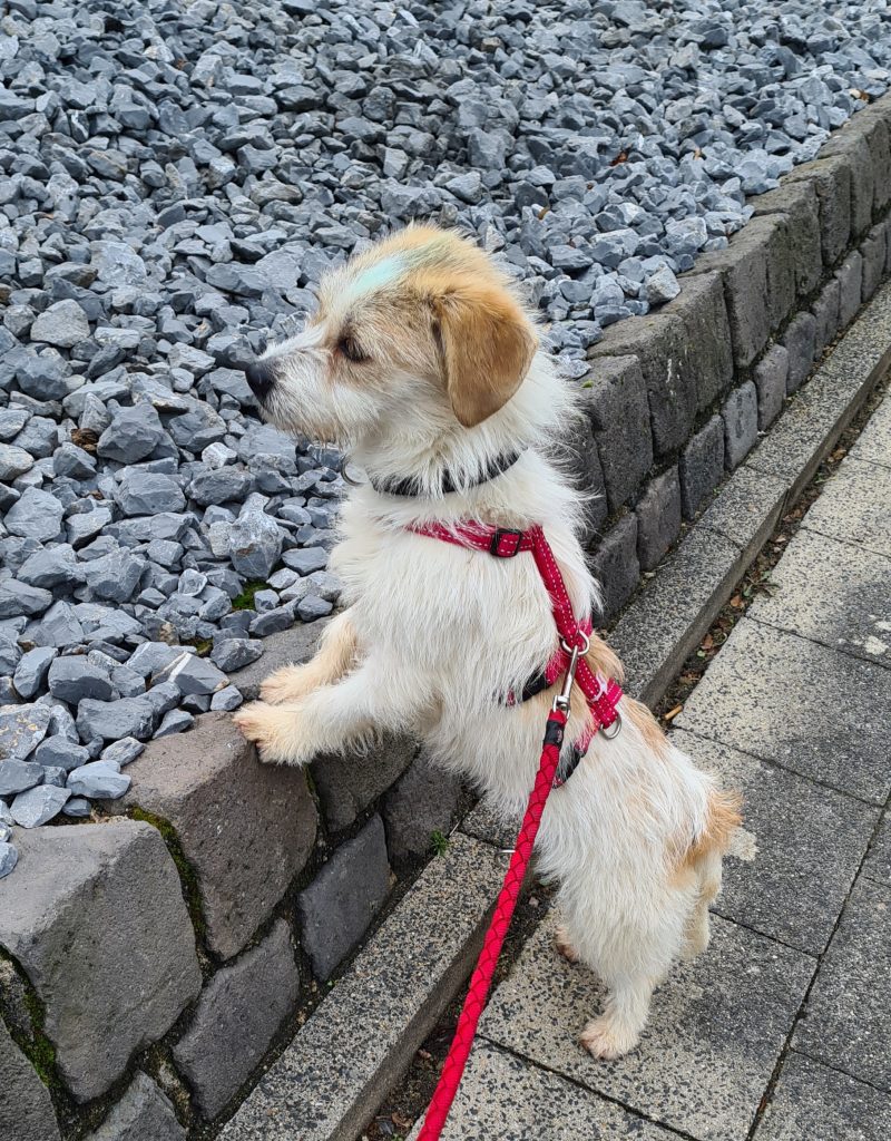 Die kleine Emely macht sich schon ganz gut an der Leine und tippelt neugierig mit. Einige Dinge, die ihr offenbar noch fremd sind, schaut sie sich genau an und geht dann weiter mit.