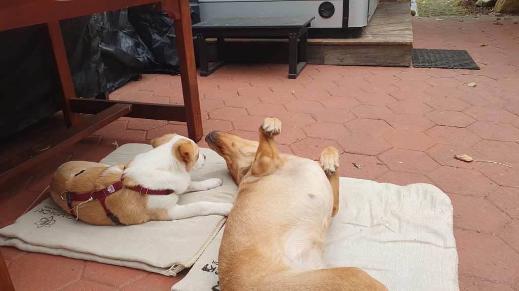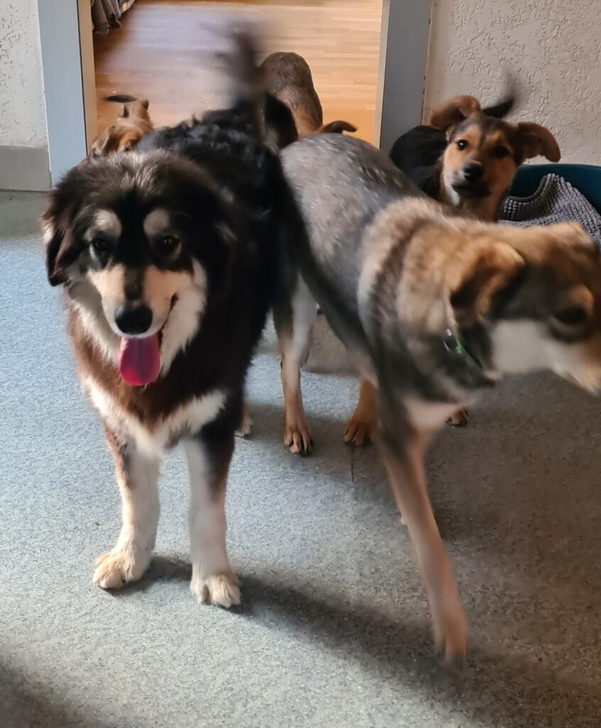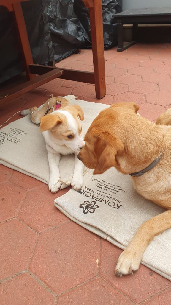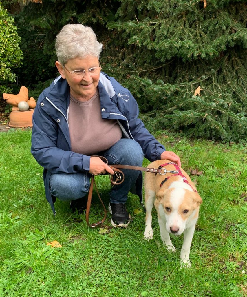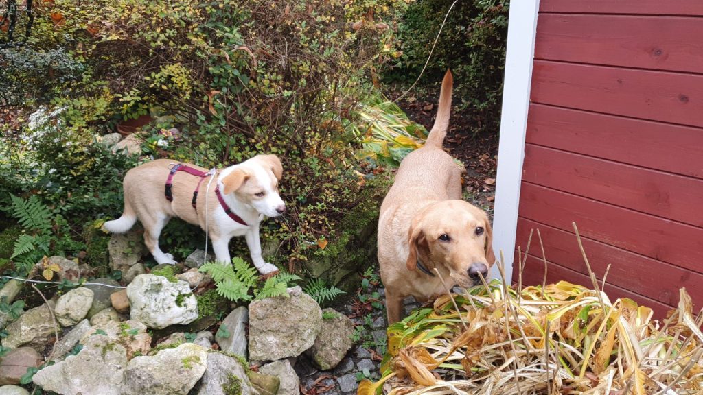 Wir arbeiten nun schon länger, mit Unterstützung eines Hundetrainers, mit den beiden hübschen Damen und sie machen ganz tolle Fortschritte! Wir trauen ihnen etwas zu, fördern und fordern die Beiden, das ist sehr wichtig für Hunde, die in manchen Situationen noch unsicher sind – und werden belohnt! Seit einiger Zeit fangen sie an, Spaziergänge zu genießen und orientieren sich sehr gut an ihren vertrauten Personen, holen sich immer wieder durch Blick- oder Körperkontakt Bestärkung/Unterstützung. Sie sind gut leinenführig, schnüffeln gerne und man merkt, wie sie immer mehr ihre Umwelt wahrnehmen, neugierig sind und endlich etwas erleben möchten. Menschenbegegnungen sind problemlos, andere Hunde finden sie generell großartig, jeder Artgenosse ist erstmal toll und sie möchten am liebsten jeden freudig begrüßen. Auch Begegnungen mit Joggern, Fahrradfahrern, spielenden Kindern etc. bewältigen sie ohne große Probleme.