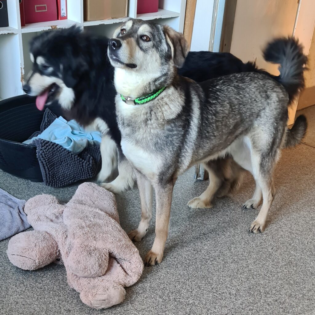 Der regelmäßige Kontakt auch zu anderen Artgenossen sollte gewährleistet sein. Sie toben und spielen bei uns in der offenen Hundegruppe auch sehr gerne, mal getrennt und mal gemeinsam, mit den anderen Hunden.