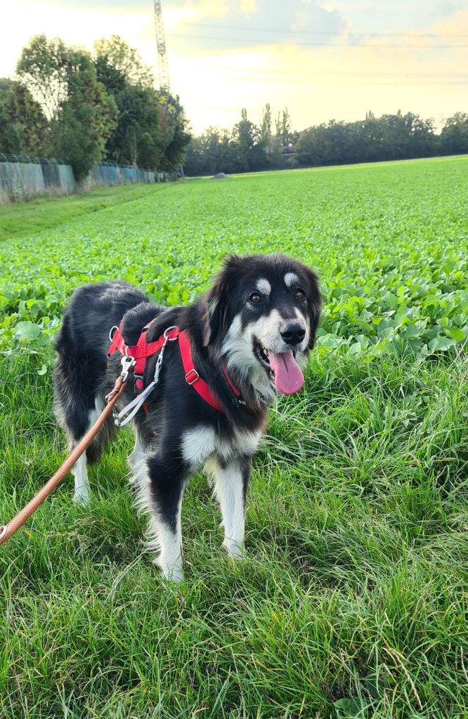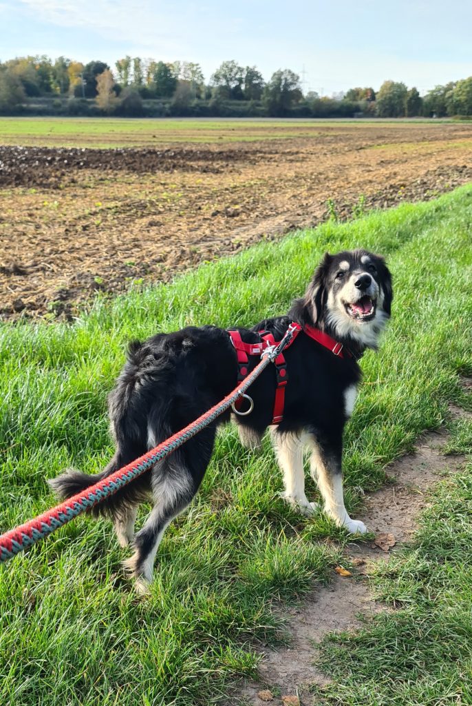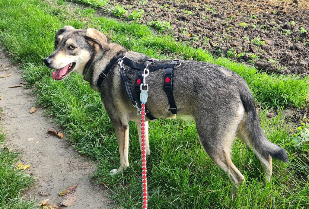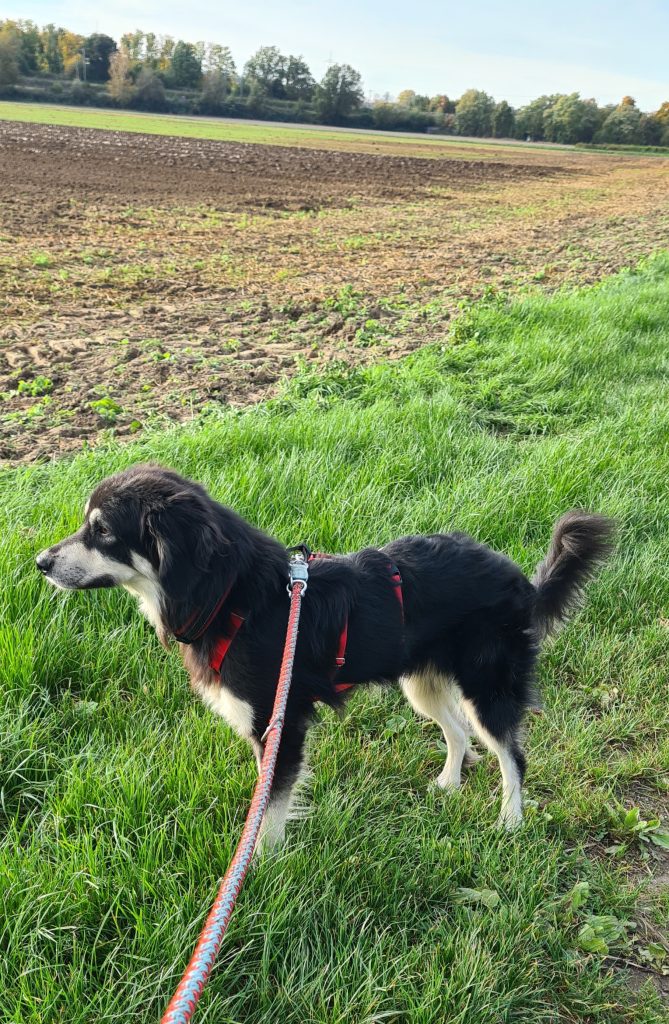 Kody muss noch vieles kennenlernen, Gassi gehen üben wir mit ihm, noch findet er alles um ihn herum befremdlich und manche Dinge machen ihm noch Angst. An Geschirr und Leine gehen ist auch noch ungewohnt für ihn, er macht sich aber immer besser und wird mutiger.